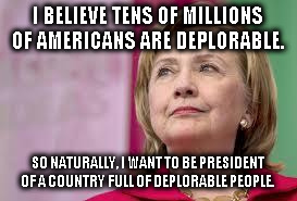 Is this really the type of person we want to be president? Do we want someone who dismisses tens of millions of people simply because they don't support her politically? Why does Hillary Clinton want to be president of a country with so many deplorable people anyway?